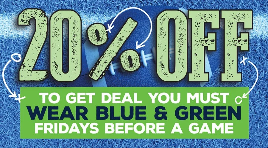 In-store orders only (not valid for online pick up or delivery orders). 20% Off to individuals wearing Blue and Green (one person wearing colors for group not allowed). Total discount not to exceed $30. Not valid with any other offer or promotion, or with Carte Clam. Not valid on alcohol. Not valid at stadium locations.
